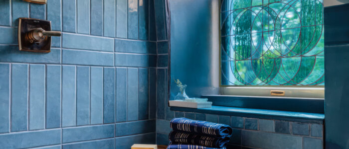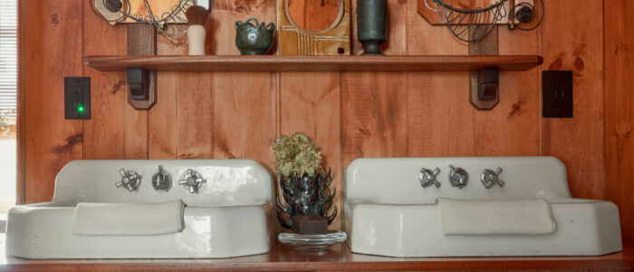 The Powder Room, by Taupe Stories Studio (Delaware County and Brooklyn), proves that whimsy is compatible with rigor. Its hydrangea-inspired chartreuse limewash walls glow around a cherry vanity by Beacon’s Palmer Works and ceramic wall hanging by Kingston artist Demetria Chappo. A stool by Poughkeepsie’s Dean Babin brings a chunk of modern functionality to the small space.