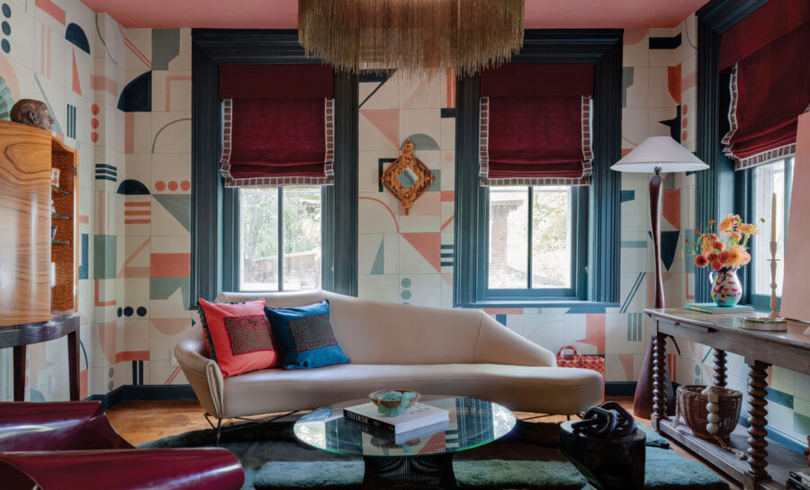 Downstairs, the Groove Room by Salisbury, Connecticut-based Casa Marcelo Interiors channels midcentury cocktail culture through a kaleidoscope of color and pattern. It’s warm and sociable, with a record player and hand-painted wallpaper from Porter Teleo that looks like someone translated jazz into brushstrokes.