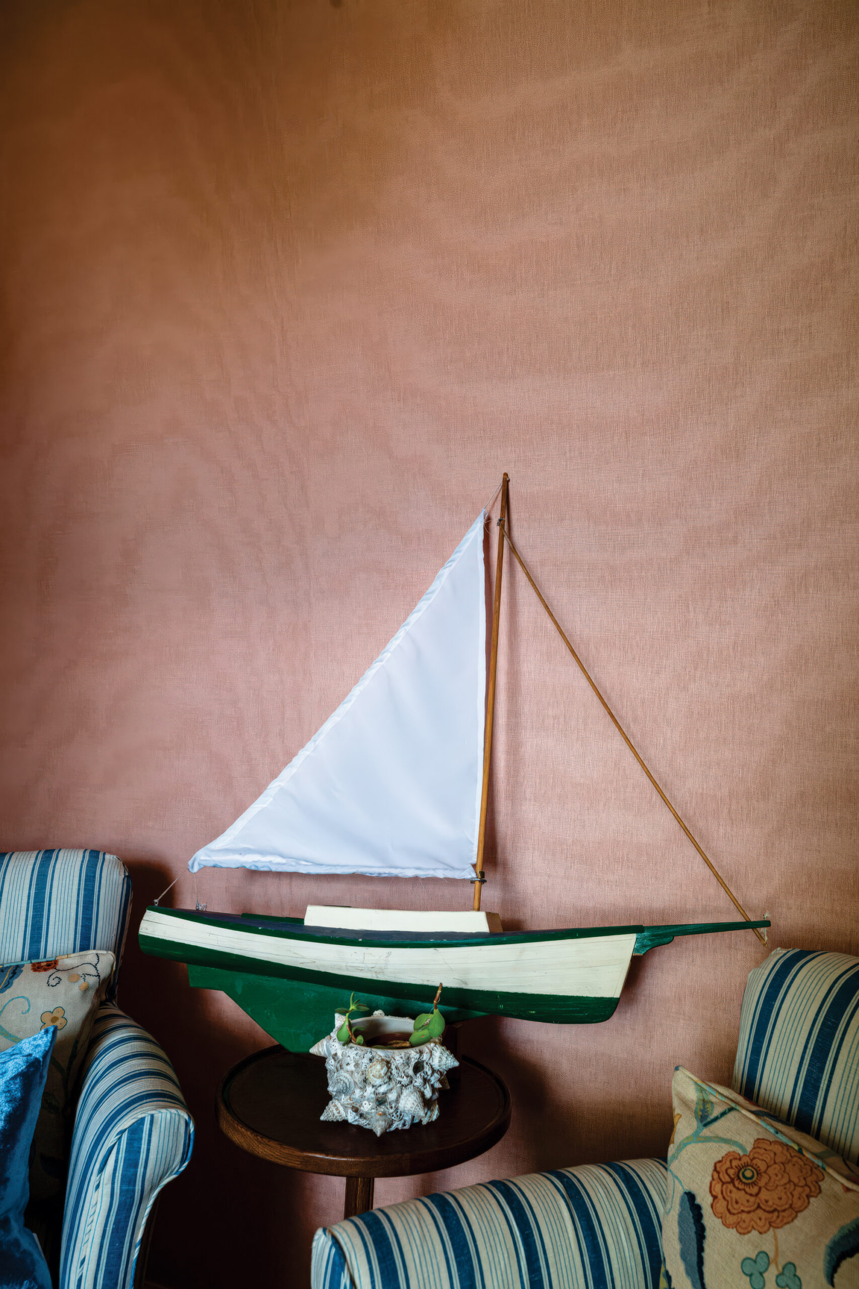 Upstairs, Catskill-based designer Lyndsey Alexander transforms a study into a seductively self-contained world. A Room of One’s Own feels like a femme Don Draper retreat—pinkish moire wallpaper by Dedar Milano, a mirror and chair by Kingston’s Sawkille Co., and, tucked discreetly into the closet, a bar by SP Wooden Works in Catskill with a quartzite countertop from Caliber Granite in Kingston. Because inspiration, like writing, benefits from proper hydration.