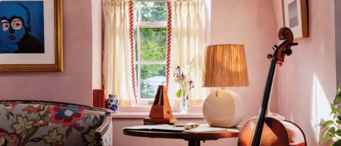 The Rose Music Room, from Troy’s JL Caccamo Design, pays homage to the house’s 19th-century roots. A cello and a clarinet rest by music stands beneath soft lighting, evoking an era when family entertainment meant playing together rather than streaming separately.