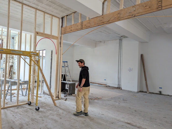 Housed within a three-bay building, The Common Good occupies the middle and far-right bays—two adjoining 900-square-foot storefronts that needed to be transformed into a complete 1,800-square-foot venue. Together, the team set out to transform Goldman’s vision into a space that accommodates a bar, seating areas, a children’s playroom, a stage, and shelves for an ever-expanding collection of books—all within a limited footprint.
