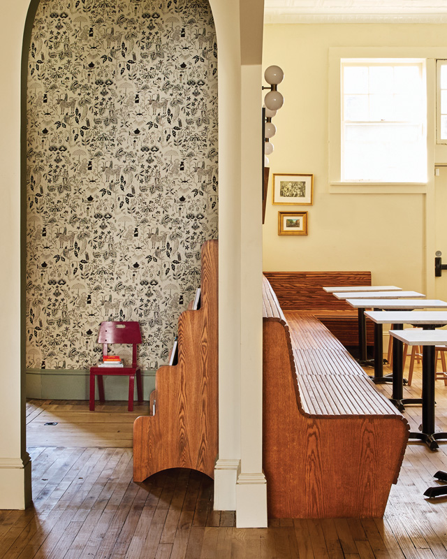Once construction began—a six-month process—one major challenge was working with the building’s historic features. Beneath tile-covered floors, the team uncovered original hardwood that Leeds was eager to restore. “A lot of my design practice involves restoration,” she says. “If the materials are there, I always want to try and keep them.” Along with the floor, they preserved the building’s original tin ceiling tiles. Leeds sourced matching ones to replace those that were damaged.