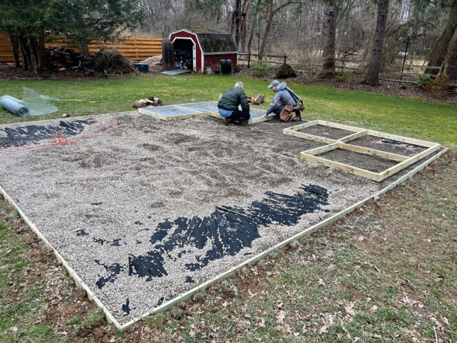 Construction began with leveling the site, laying down landscape fabric, and building a shallow wooden frame to hold a base of crushed stone. Pre-cut lumber made assembly fast—an essential move considering two of the build days were rainy and miserable.