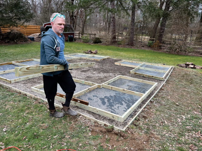 Bock hauls lumber as the first layer of the raised beds takes shape. The boxes were built atop landscape fabric and gravel to promote drainage and deter weeds.