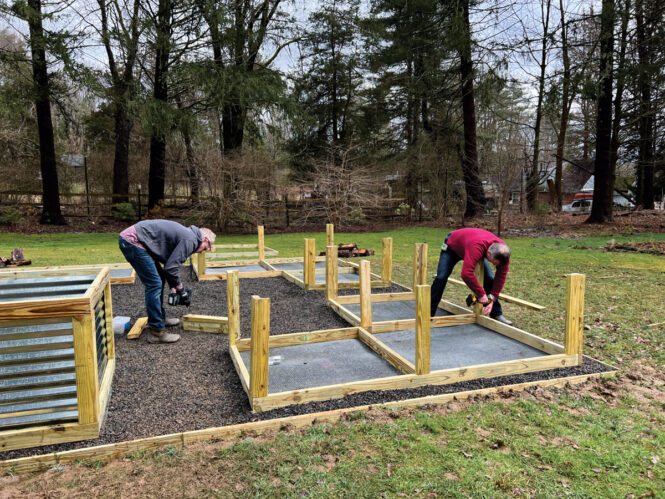 Steven Bock and Tim Rich assemble one of the raised beds using pre-cut lumber. Careful planning and teamwork helped speed up construction, even on a pair of rainy build days.