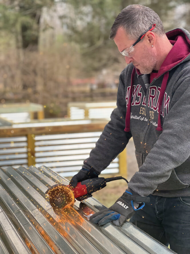Ayers uses an angle grinder to cut corrugated steel to size for the planter cladding.