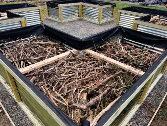 Once the frames were assembled and the metal cladding was attached, the real workout began: filling the beds. Instead of trucking in expensive fill, Ayers turned to a resource on hand: piles of fallen trees and branches, which he layered into the bottom two-thirds of the boxes—a method known as hugelkultur. Over time, the organic material will break down, enriching the soil above and sustaining the garden naturally.
