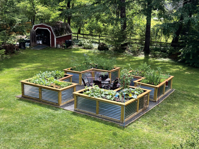 Determined to marry form and function, Ayers spent weeks researching designs that would complement his modernized farmhouse-style home in Stone Ridge. He found inspiration online in raised beds clad with corrugated steel and wood—and took the idea a step further. Instead of stand-alone boxes, he envisioned a full garden “room,” where he and his partner could sit at a central table, surrounded by the lushness of growing things.