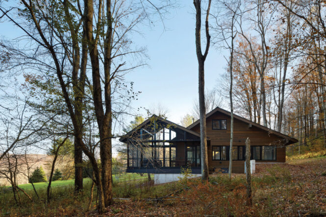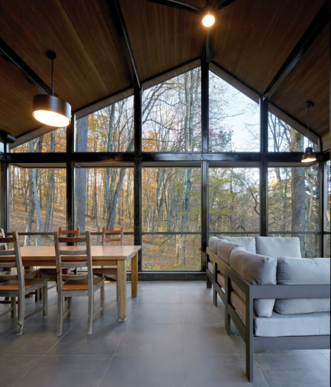The design centers on the glass-enclosed porch, cantilevered dramatically to create the feeling of floating among the trees. “It’s all about being in the woods and engaging with that meadow view,” Gaffney explains. “When you’re on the cantilevered porch, it feels like a perch. You’re elevated and surrounded by the trees. It was a structural challenge and could have easily been value-engineered out, but the clients and contractor were committed to the idea. Because of that, you can experience the site in such a unique way.”
