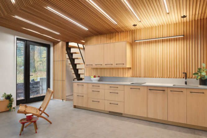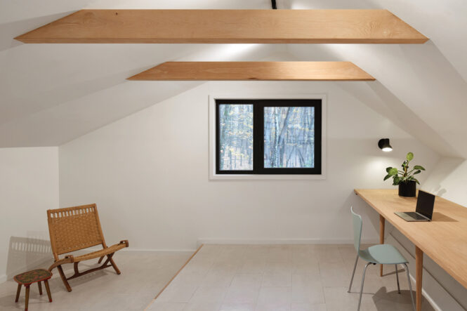 Above the main level, the cabin features an upper-level loft tucked beneath its prominent metal roof. Originally conceived as an open mezzanine, the loft was enclosed during the pandemic to create a private workspace. Gaffney transformed this necessity into a sculptural feature, designing slatted wood panels that extend from the loft to the back hallway.