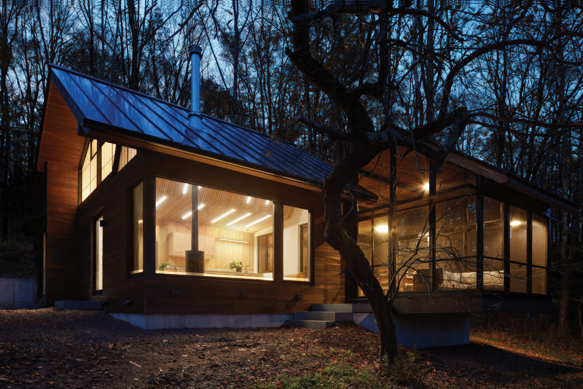 The framing of these panes, along with the porch doors and windows, evokes the aesthetic of traditional Japanese homes, where shoji screens are framed in dark wood. This design element gives the cabin a modern yet inviting presence, particularly at dusk when light glows softly from within.