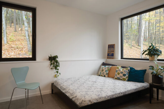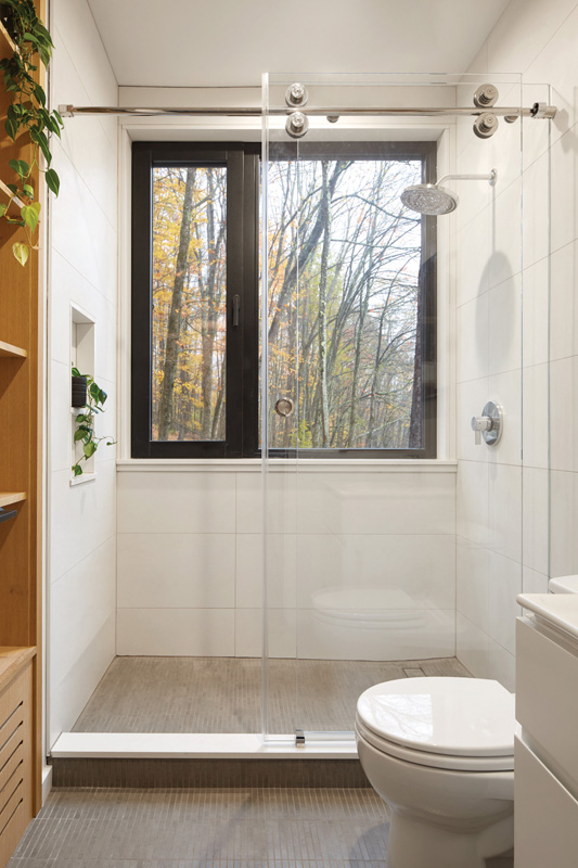 The cabin’s envelope is highly efficient, with triple-pane Passive House windows that help regulate indoor temperatures year-round. While the project didn’t pursue Passive House certification, Gaffney incorporated many of its principles. “The windows were a significant upgrade,” she says. “Triple-pane glass is not standard, but it made a big difference in terms of energy efficiency.”
