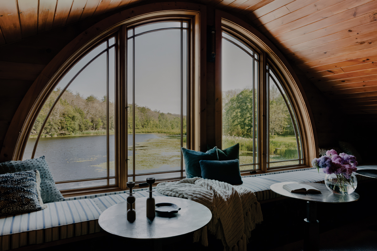 On the second floor of the lodge, the sunroom enjoys ample views of the lake and woods through an oversized arched window.