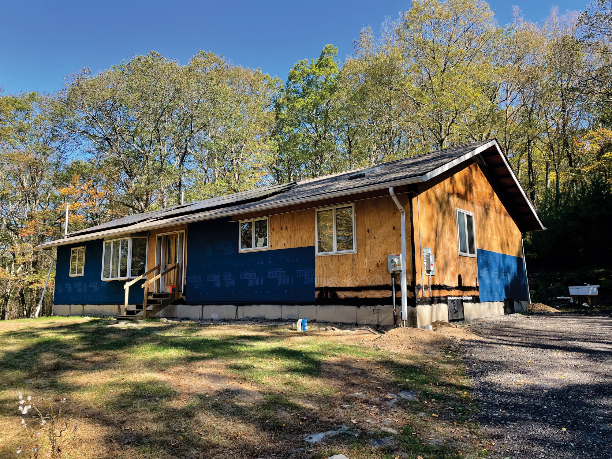 In the Sullivan County house, we used a product called Adhero 3000, also made by Pro Clima, on the exterior walls once they were stripped of siding. It’s a self-adhesive membrane that we applied to the sheathing, from the top two inches of the foundation to the top of the exterior wall. We then insulated the interior of the wall cavities and applied more Intello under the finish drywall, forming a five-sided box. The sixth side of the box is the basement floor, or the first floor, if you have an unfinished basement and you don’t plan on using your basement as living space in the immediate future. If not, treating the basement ceiling (the floor for the first floor) with a smart vapor barrier and insulation is the right move.