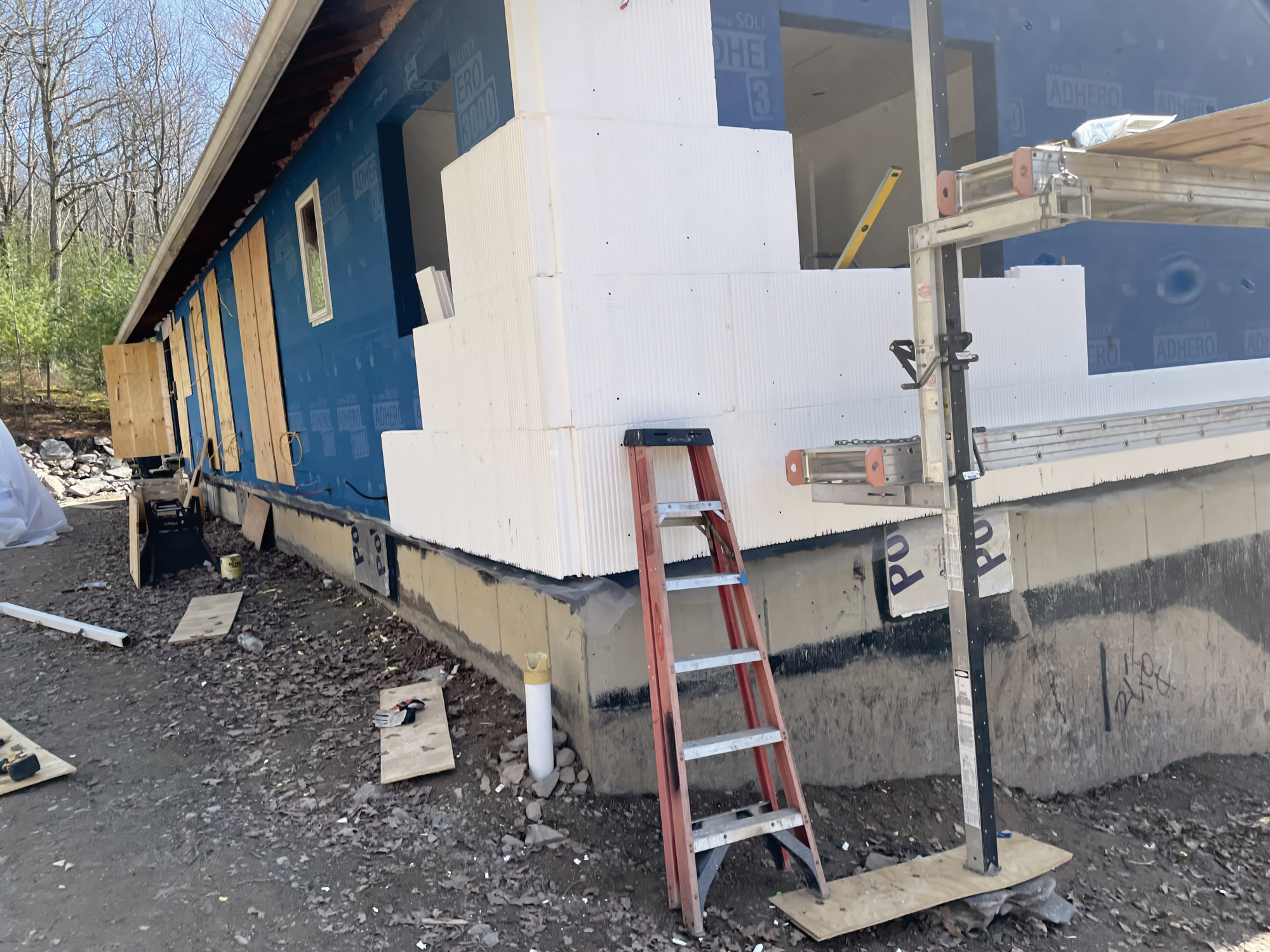 The exterior of the house will need insulation as well, and it’s a code requirement in an increasing number of districts. We use the very same product on the sides of exterior over the Adhero membrane. In this application, we screw it and glue it, then mount whatever siding we decide to use right onto the InSoFast. We use a lot of concrete Hardie board siding products, and it holds up to the additional weight and installation requirements very well. InSoFast panels exceed most code-mandated insulating requirements all over the country, so the building inspectors love this product as well.