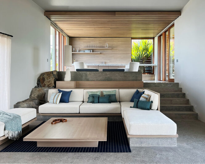“All of the floors are concrete with a lot of the local aggregate from the site ground into the floor, so that it very much becomes the color of the dirt and the ground and the mountain,” says Bremer. “The guest wing is entirely buried underground into the mountain, with the main house rising out of the rocks above. Below that is a series of te
