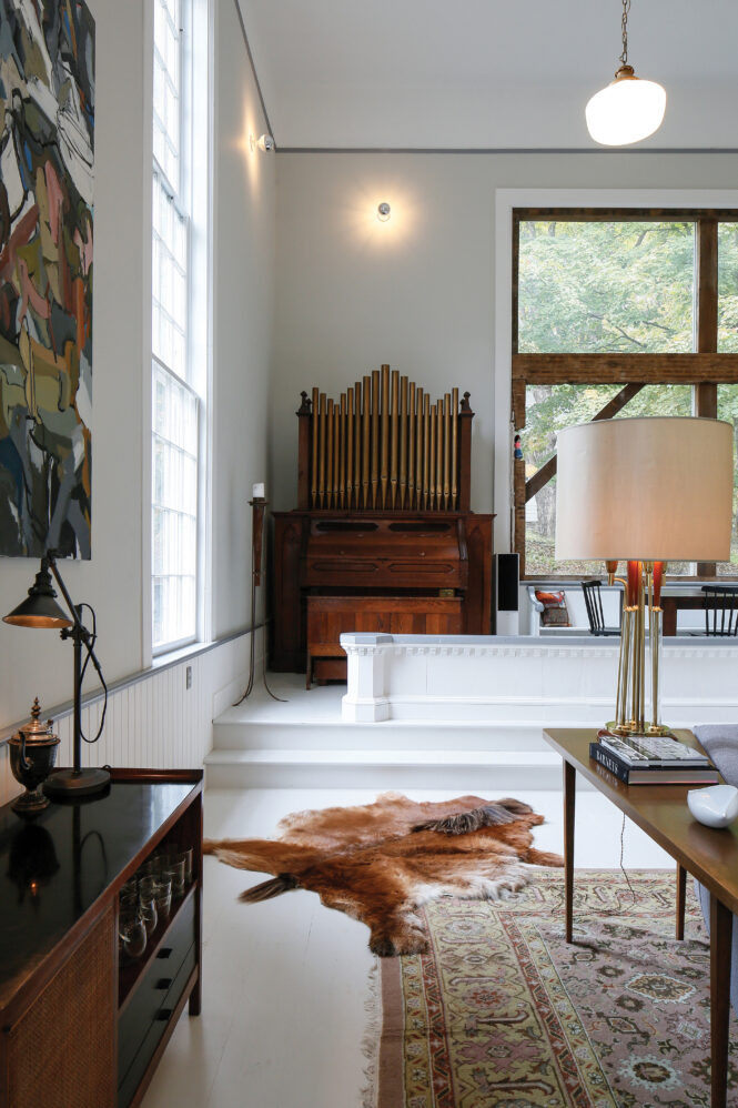 The fantasy-making modern house stands in direct contrast with Bremer’s own home, a historic former church in the tiny hamlet of Phillipsport that demonstrates his adaptive reuse skills. He purchased the 200-year-old building in 2016, and his subsequent renovation landed it in the New York Times, Architectural Digest, and among Vogue’s 10 favorite upstate Airbnbs. The picture book exterior has aged gracefully. The sunny interior is now crisply modern, a home-as-sanctuary with 14-foot-high windows and 20-foot-high ceilings. “People are always blown away when they see it in person after the photos,” says Bremer. “It’s so cozy. It’s actually really big, but it’s warm, intimate, and inviting.