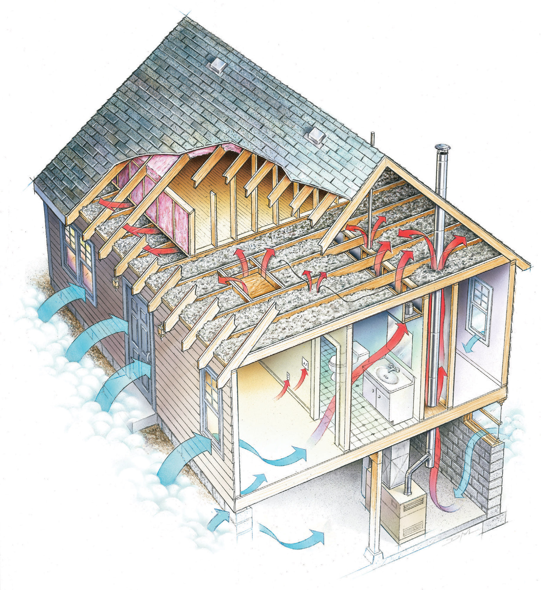 This diagram illustrates how air moves through an under-sealed attic: warm indoor air rises and escapes through gaps around wiring, plumbing, and framing, while cold outside air is drawn in from below to replace it. Proper air sealing blocks that upward convection, and continuous insulation slows conductive heat loss, keeping conditioned air where it belongs and reducing the stack effect that drives drafts and energy waste.