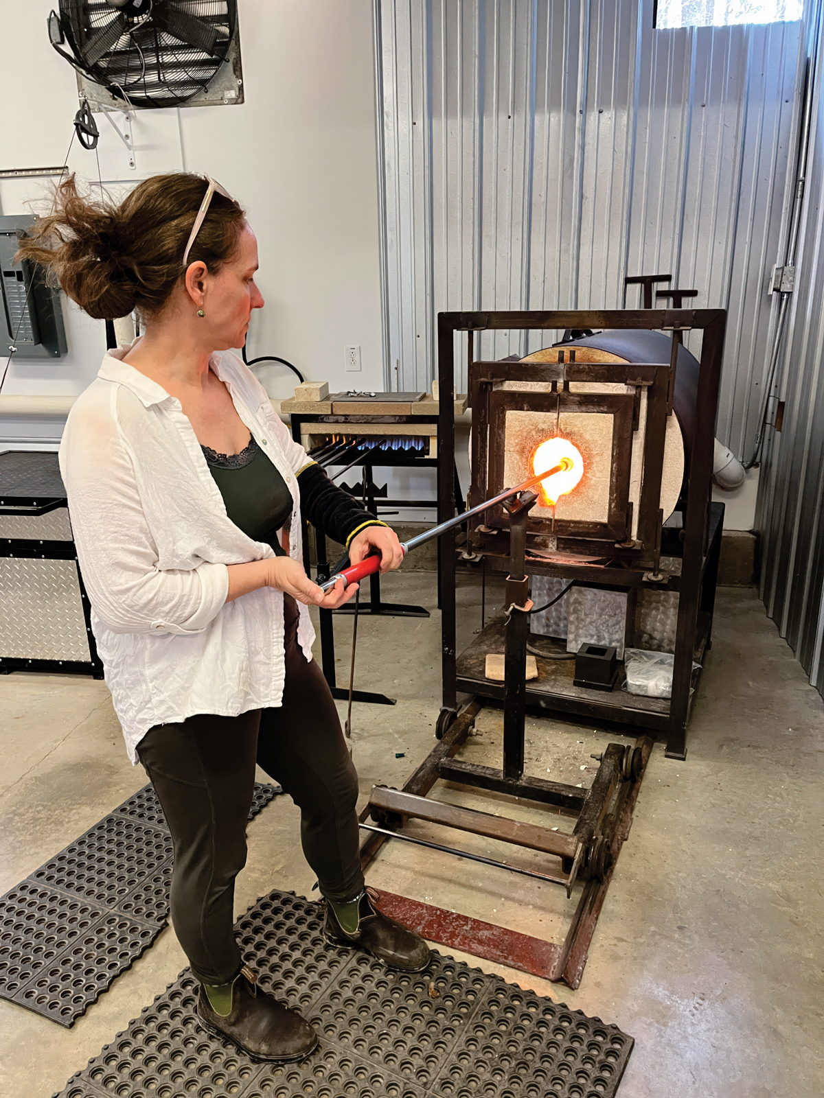 Elizabeth Crawford reheats a glass piece in the furnace at at Hoogs and Crawford Glassworks, where tradition meets intricate, contemporary design.