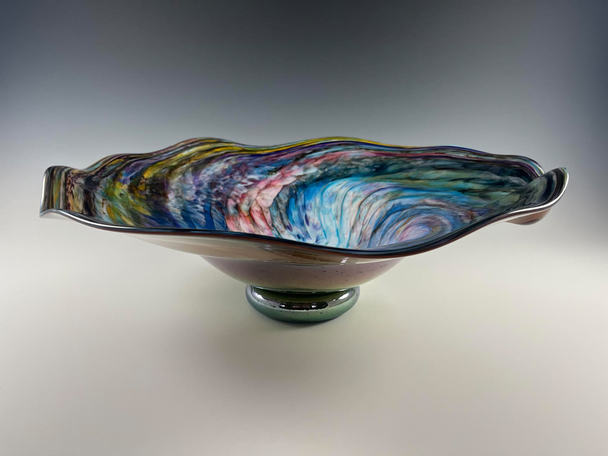 Pierre Bowring shapes molten color into bold, painterly forms at his East Chatham studio, blending abstract art and craft in a fluid, firelit dance.