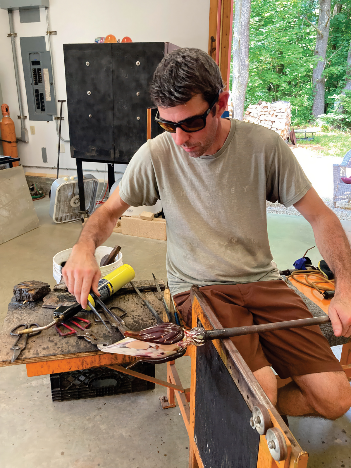 With steady hands and practiced precision, Nathan Hoogs shapes molten glass.