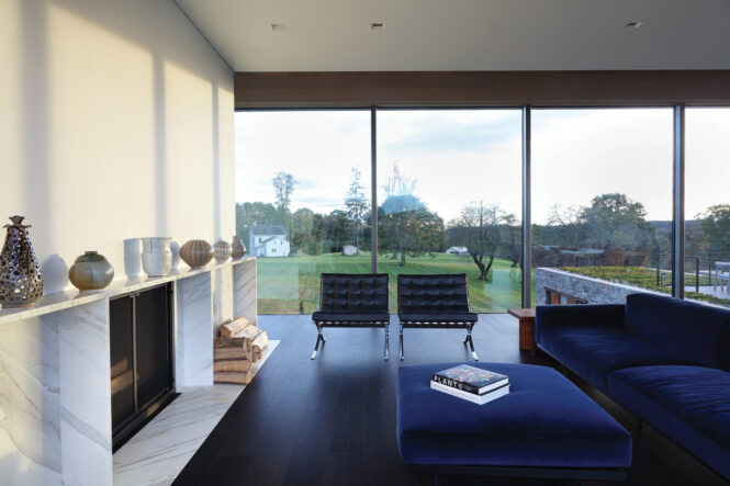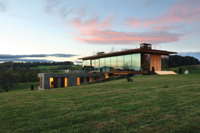 That’s precisely what Link Farm House is. Set on a sprawling 220-acre farm in the rural Dutchess County town of Stanford, its design is strikingly unusual: Two oblong rectangles stacked perpendicularly, one with floor-to-ceiling glass, and the other wrapped in locally sourced stone.