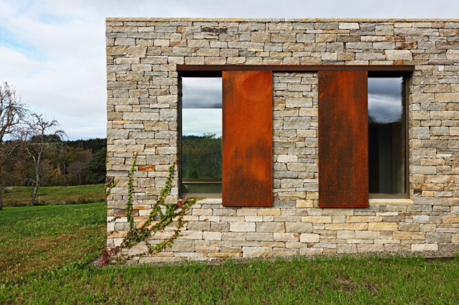 The stone portion of the house is peppered with Corten steel shutters, which naturally develop a rust-like patina over time.