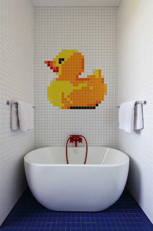 A playful rubber ducky tile mosaic in the bathroom was installed to delight the homeowners’ three children.