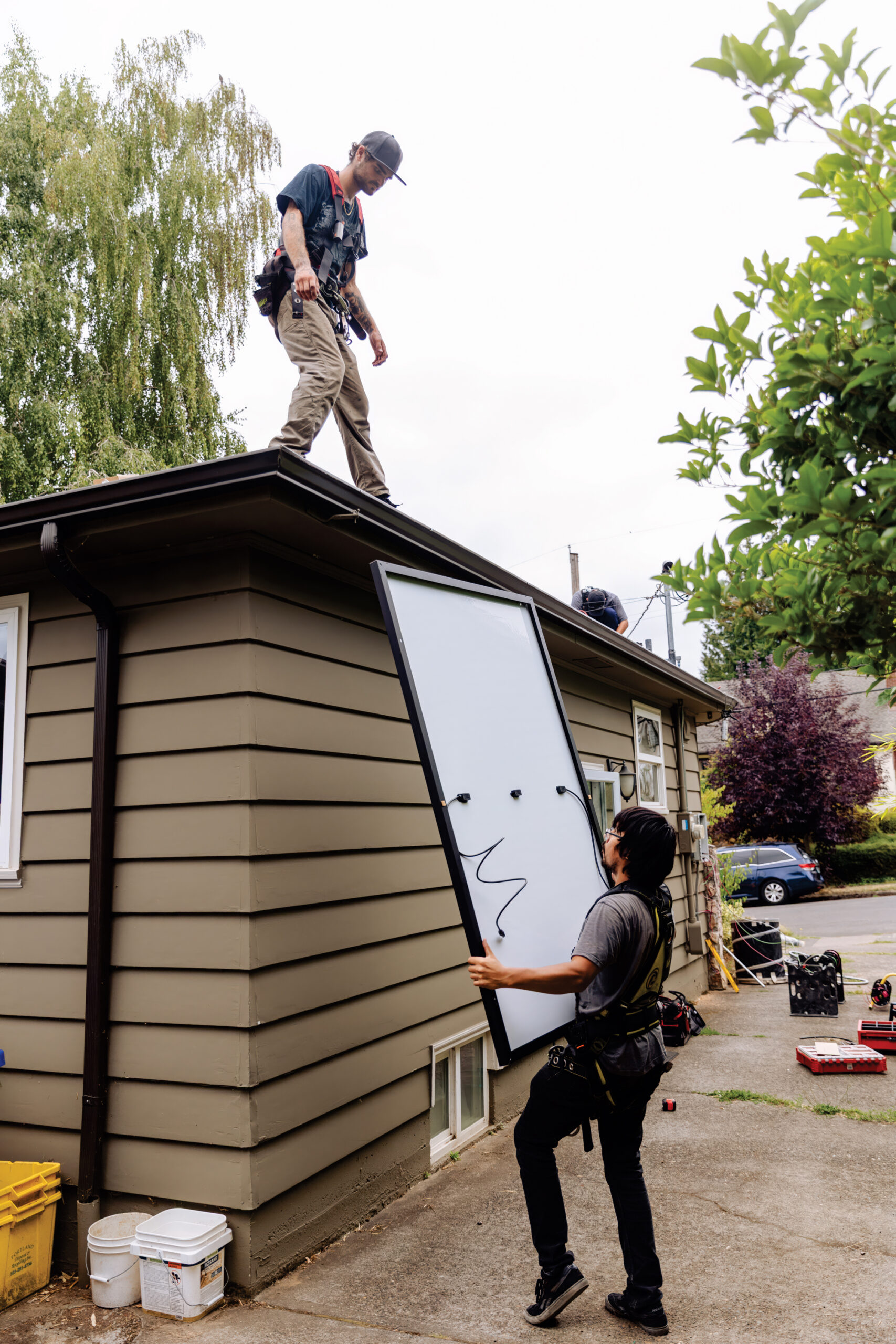 A crew lifts a solar panel into place. For many homeowners, rooftop solar is less about gadgets and more about owning their own energy future.