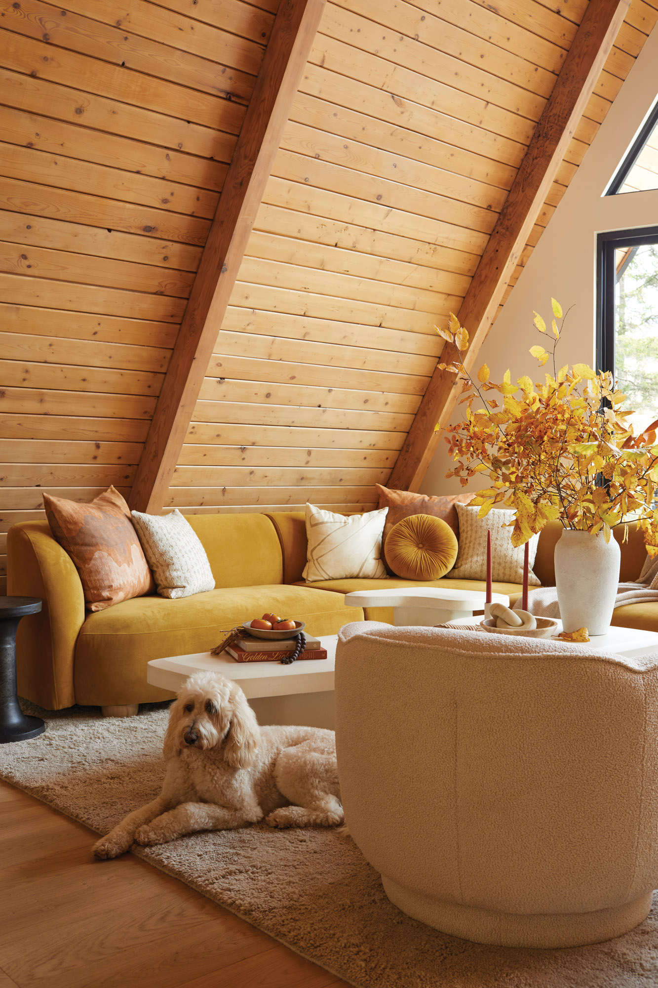 The living room remains firmly within the original A-frame, its pine paneling carefully stripped of its glossy, yellowed shellac and refinished to feel closer to raw wood. Smith tested countless stains before landing on a matte Bona product that subtly neutralizes the yellow tones without obscuring the grain. The result feels both authentic and updated—pine that looks like pine, just calmer.