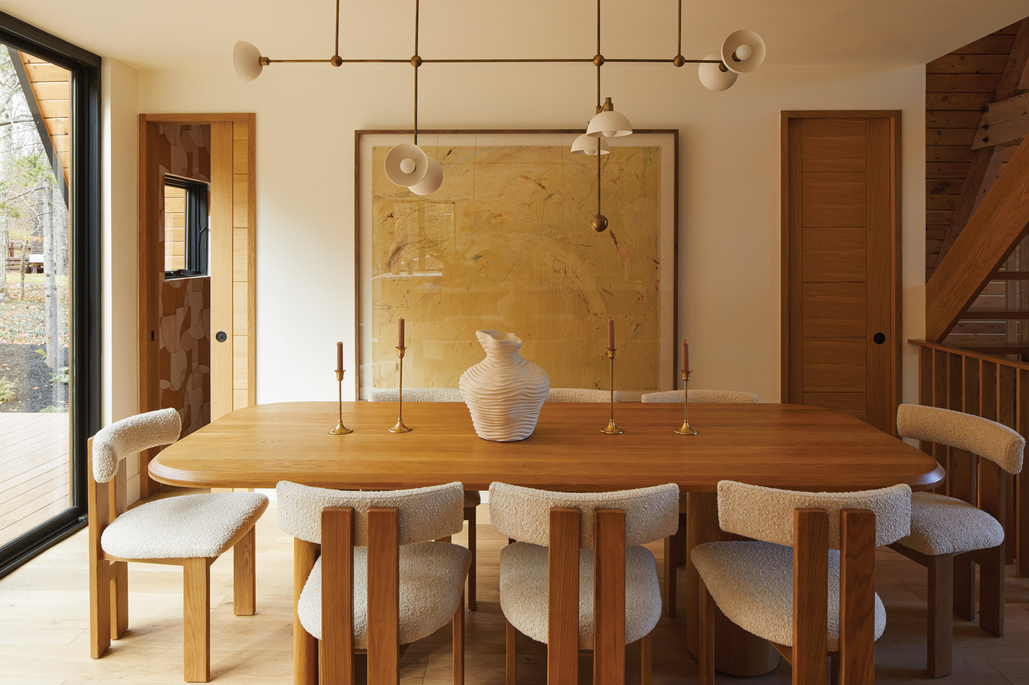 In the dining area, a modernist Apparatus chandelier stretches low and linear above the table, anchoring the room as a functional piece of sculpture and reinforcing Smith’s belief that everyday moments—like sitting down to eat—deserve a sense of occasion. Photo: David Engelhardt