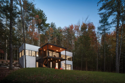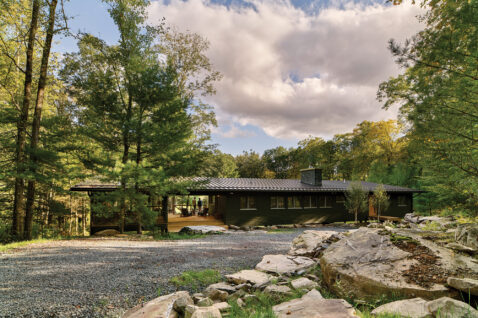 Inside the Dickerman Residence, a Low-Slung Sullivan County Home by Richard Pedranti: Designed by architect Richard Pedranti, the Dickerman Residence in Sullivan County uses a simple shed form, natural materials, and high-performance strategies to create a home that settles easily into its wooded site.