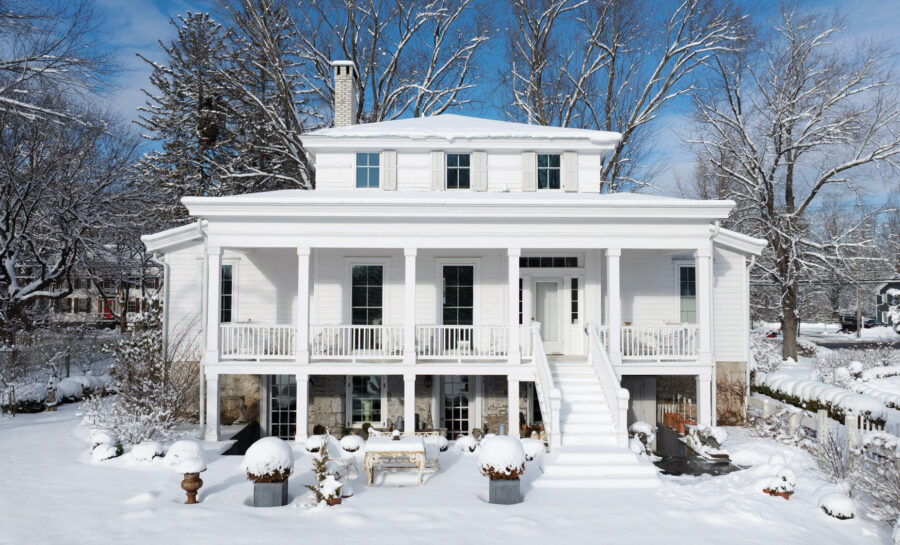 Verandas span both the front and rear façades, extending the living space outdoors and reinforcing the home’s formal symmetry. To the rear of the property, a barn and heated carriage house provide flexible additional space—suitable for storage, studio use, or future adaptation—while maintaining the estate-like feel that distinguishes Maple Lawn from more compact village homes.