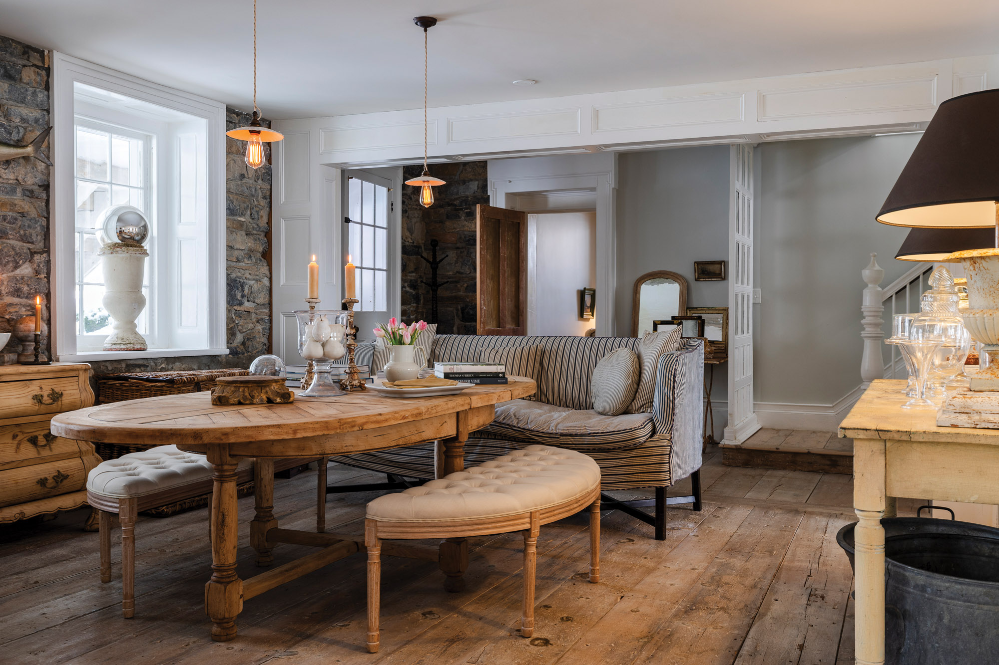 A main-floor living area at Maple Lawn layers wide-plank floors, exposed stone walls, and soft, neutral furnishings, creating a relaxed counterpoint to the home’s formal Greek Revival architecture.