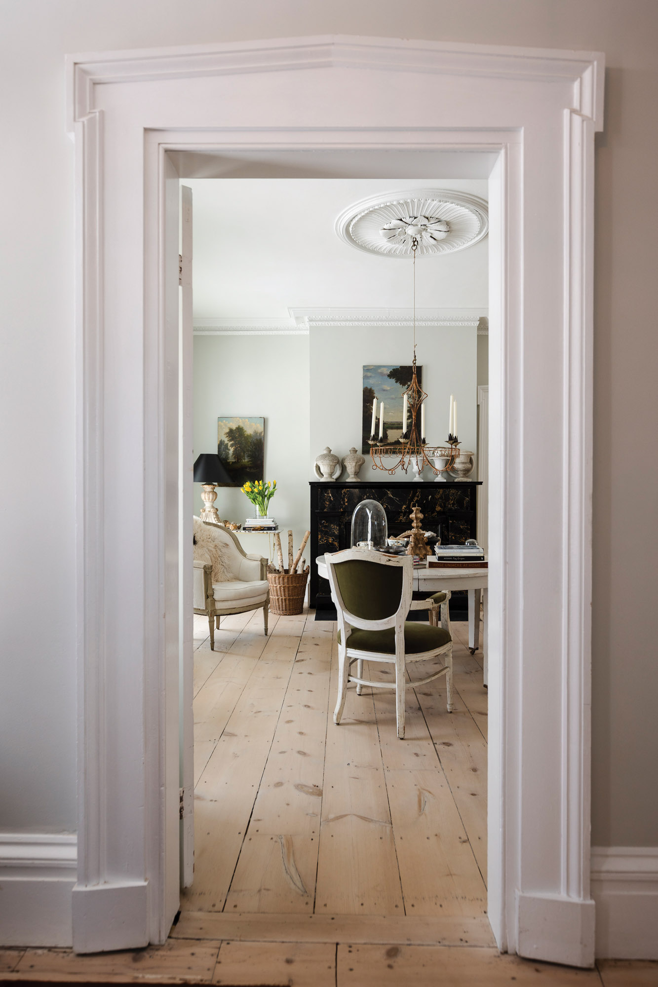 Seen through original Greek Revival trim, a formal parlor showcases restored pine floors, period moldings, and a marble fireplace, with light-filled proportions that reflect the home’s 1843 origins.