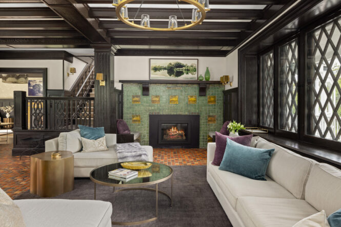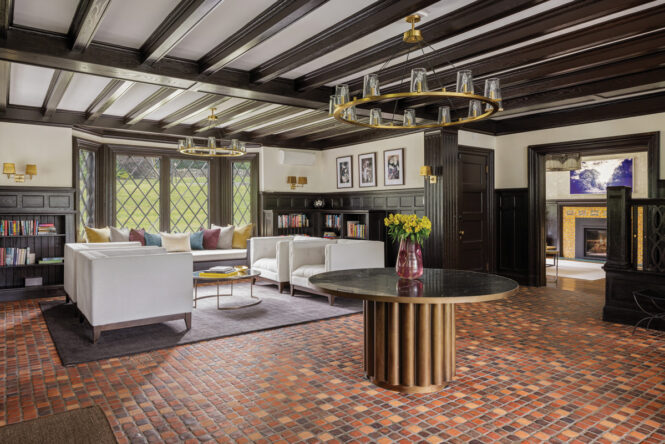 The grand main gathering room at Hudson Shore Estate, featuring original circa-1900 mosaic floor tiles from Pennsylvania’s legendary Moravian Pottery and Tile Works.