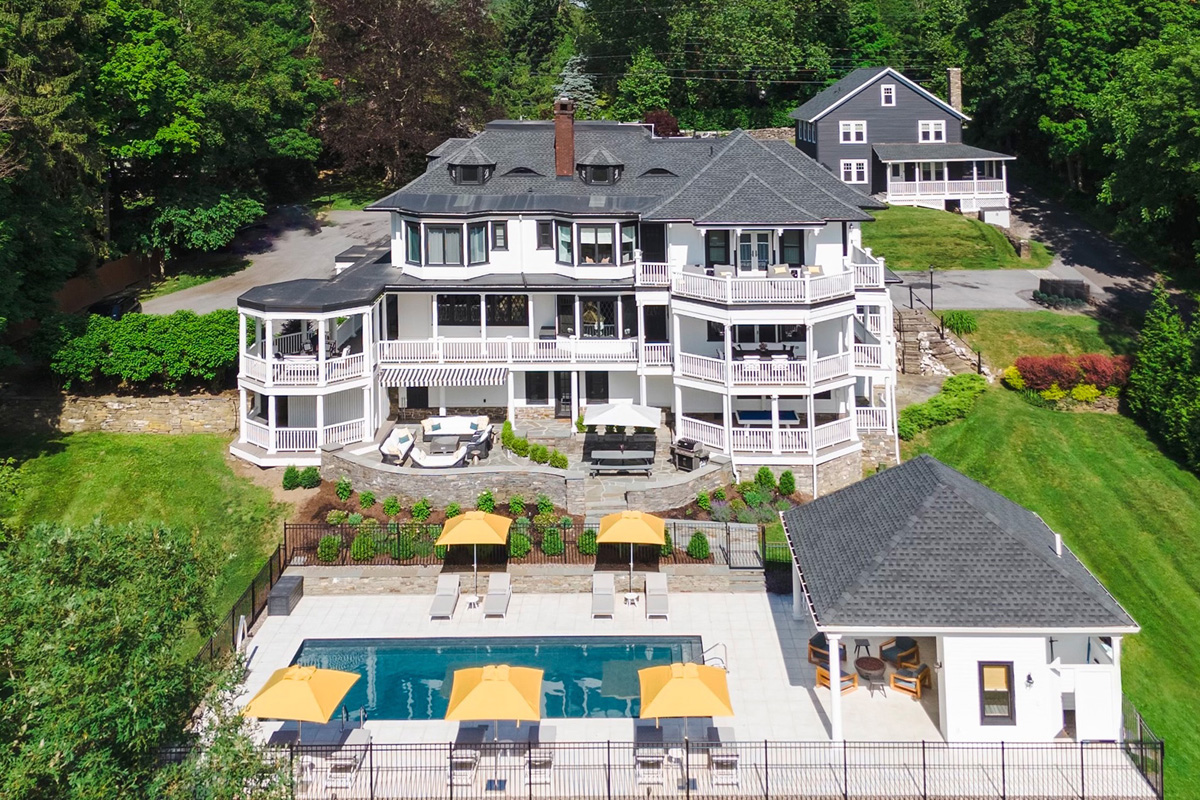 Today, the fully renovated mansion seamlessly blends historic charm with modern comfort. It boasts six-plus spacious bedrooms (each with a private bath), a Moravian-tiled living room, and original architectural details preserved from its earliest days. The 2021 renovations added contemporary amenities: a sauna, gym, heated floors, and a pool. In addition, there’s a 2,800-square-foot carriage house that has been configured into two apartments. In winter, the back of the house offers sweeping views of the Hudson River and the Vanderbilt estate across the water.