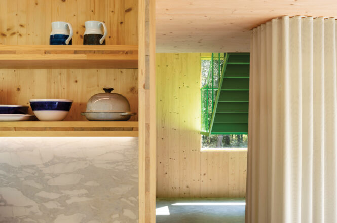 In the kitchen, the couple elected to forgo upper cabinets and instead incorporated deep pantry shelves made from CLT panels. The couple hung a second floor-to-ceiling curtain created by Julie Newton of Curtains for You in the entryway, concealing a metal coat rack and shelves.