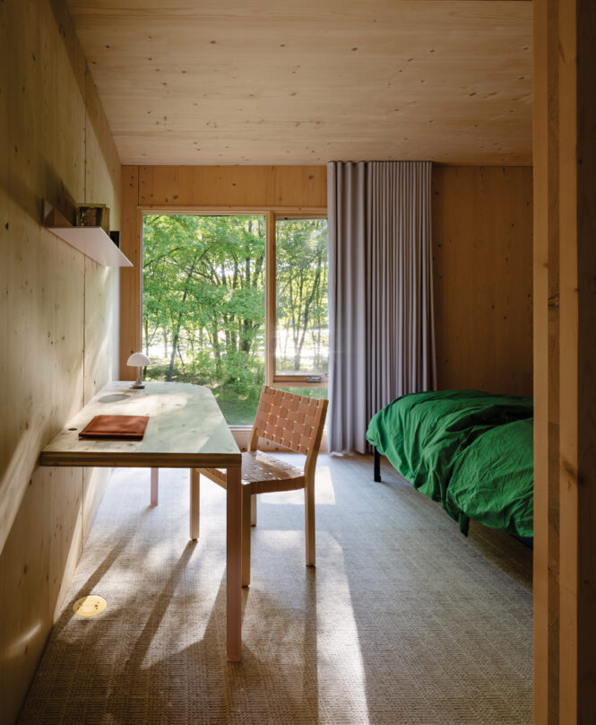 The couple spent months paddling to and from the site, tweaking their designs with each new observation, and then re-paddled along the shoreline, imagining how the home would look from the water’s edge. By 2022 they’d finalized their plans and, once they’d poured the concrete foundation, the wall and roof panels went up in eleven days. They decided to gamble on a new material, cross laminated timber—or CLT—throughout the construction. “It’s like plywood for giants,” explains Bunge of the one-inch thick engineered panels made from fire-resistant, fast growing spruce. “It’s been in the air for a while, but we thought we should try it ourselves before we recommend it to clients.”