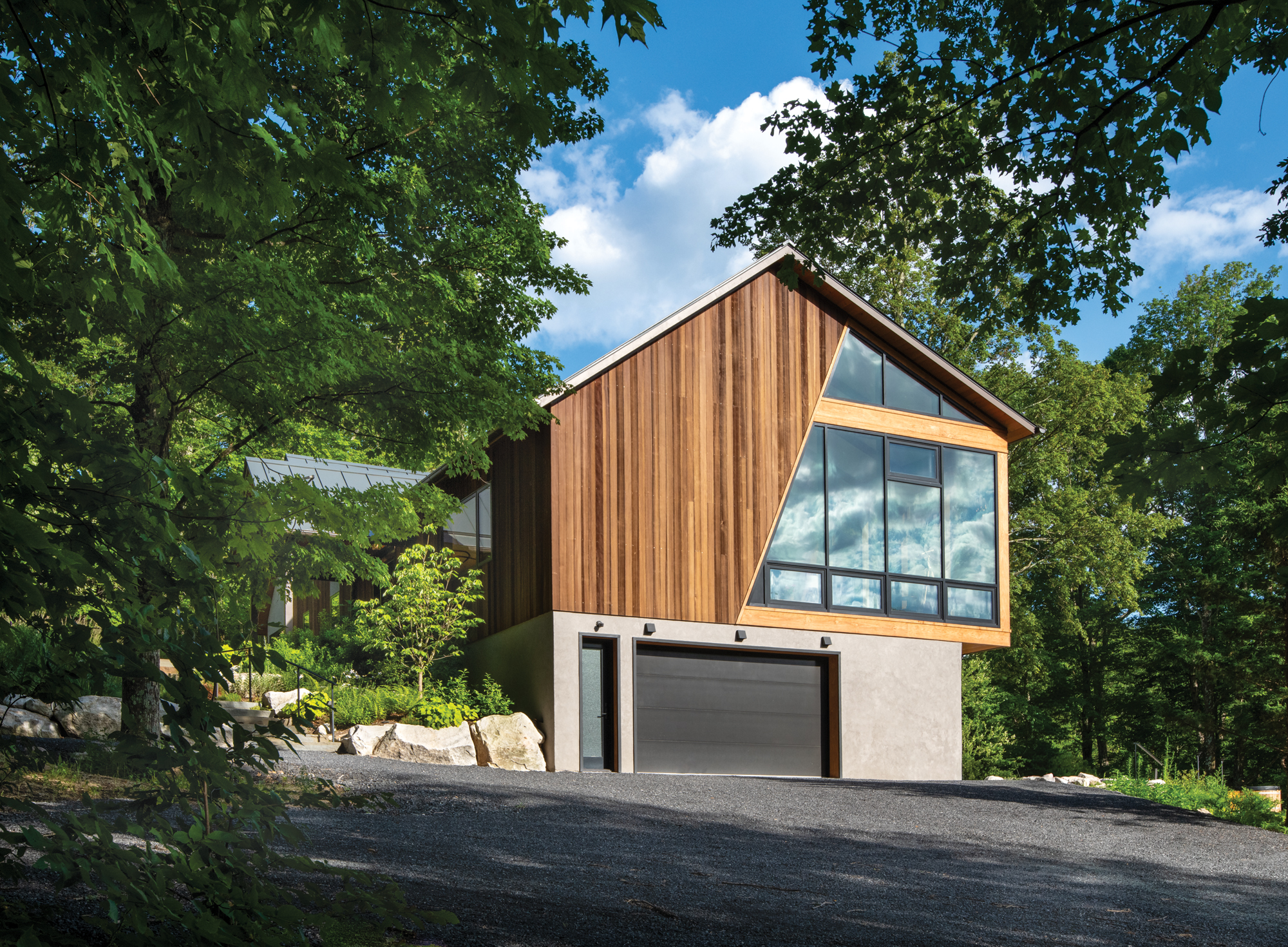 Plum Design Group’s main objective was to add light and a feeling of spaciousness to Gillon’s original design. “The initial issue with the house was that there were no good views of the cliffs,” says Jesse Meisler-Abramson. They clad the new exterior in shou sugi ban siding and added a standing seam metal roof.