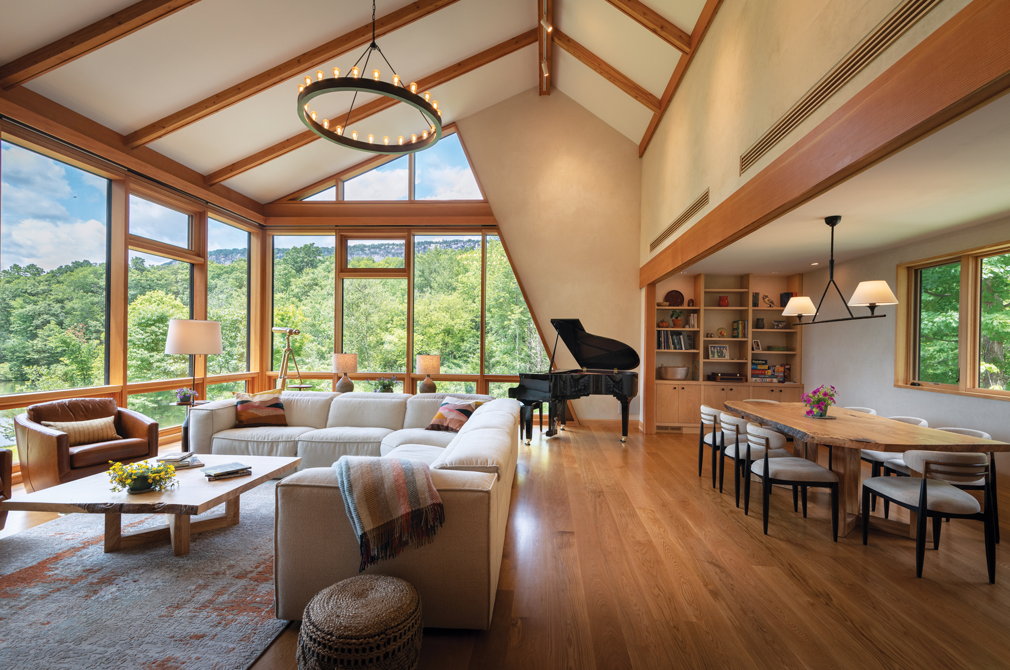 After expanding the main floor living room to include 19-foot ceilings, Plum Design Group added triple-pane glass walls from Sierra Pacific Windows. “Our goal was to create a modern aesthetic that felt comfortable and homey,” says Meisler-Abramson. While building an on-site guest house, the team found a giant dead ash tree. New York Heartwoods milled the tree, and Makers Accord built the live-edge dining table from the salvaged ash.