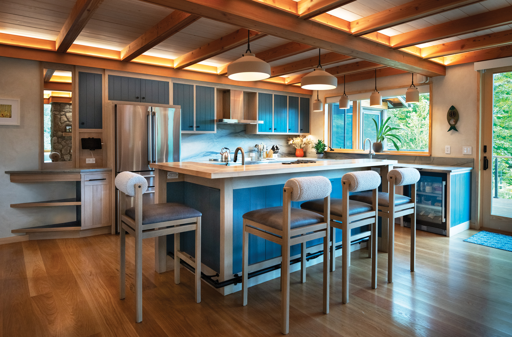 Central to the new layout, Gillon’s iconic double-sided stone fireplace—built from stones harvested onsite—works as a natural boundary between the living area and the home’s new kitchen, reaching from the basement level up to the ceiling. Here, Plum Design created a modern kitchen around an island salvaged from a giant, dead ash tree. “New York Heartwoods milled the bottom of the tree into a single slab, live-edge dining table,” says Deutschlander. “The remaining wood became the island, stair treads, railings, and smaller furniture pieces.” Deep blue Brazilian quartzite countertops and mixed sage and slate blue cabinetry enhance the organic stone fireplace and the exterior ridge vernacular.