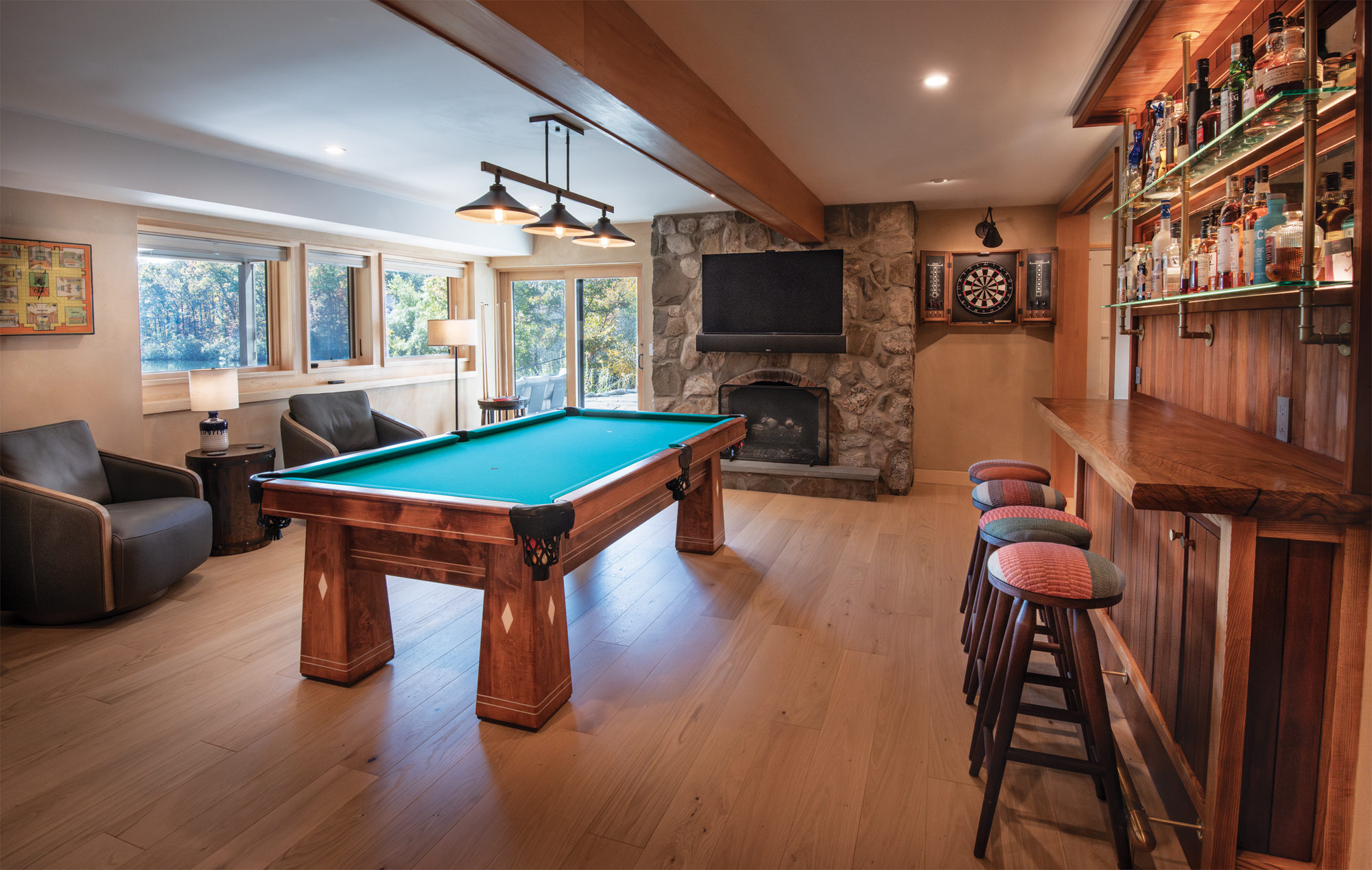 The home’s ground floor has a soundproofed family room as well as a bar constructed from redwood panels salvaged from the home’s former siding. The exterior door leads directly to another deck, the lake, and a lakeside hot tub.