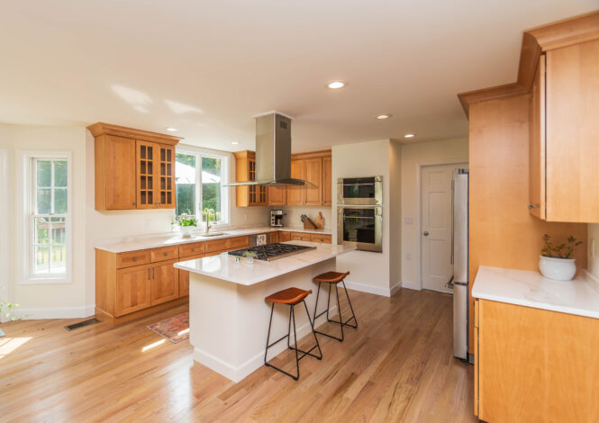 The original kitchen had beige linoleum floors that were peeling at the edges, an old cast-iron woodstove in the pass-through between the kitchen and living room that “interrupted the flow and was quite frankly a fire hazard, and the cabinets were built by hand but were weirdly not very usable,” Fields says.