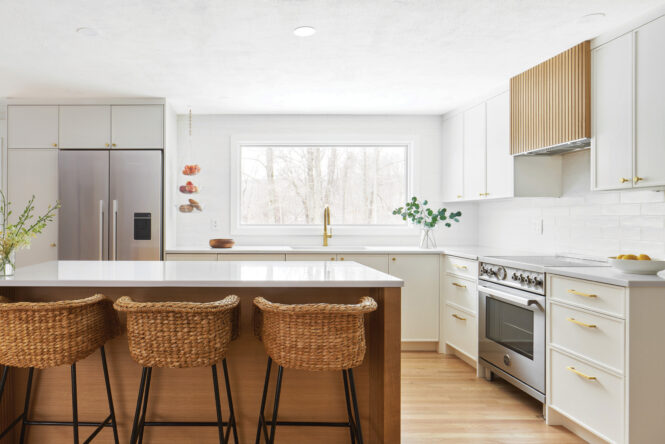Given the high cost of kitchen renovations, the Fields prioritized long-term functionality over fleeting design trends. “Our space is still very modern, but ultimately, the largest changes we made [adding a peninsula to separate the kitchen from the living room and creating a custom built-in bench for dining seating] were based on how we use the space every day,” Fields says.