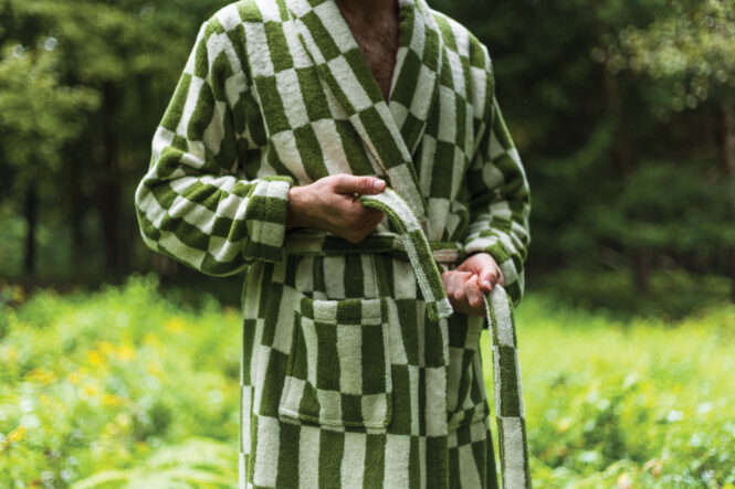 Raw materials developer Amina Iman and designer and musician Connor Mikita operate Great Indoors from their homebase in the Catskills and work with manufacturers in Portugal to produce their organic terry robes and towels. These graphic green-and-white robes are eye-catching and size-inclusive.
