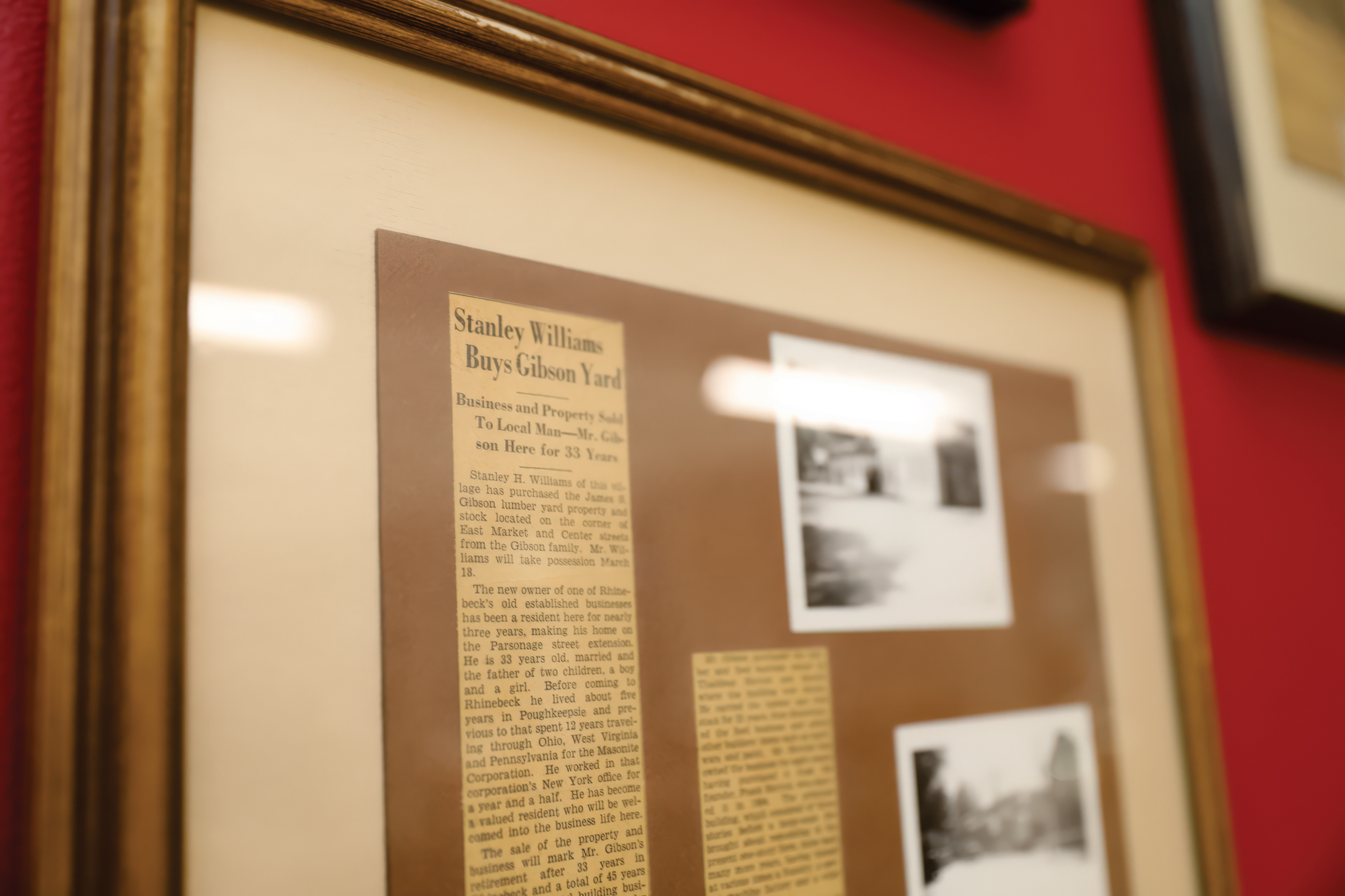 A framed newspaper clipping documents Stanley Williams’s purchase of Gibson Lumber in Rhinebeck in 1946.